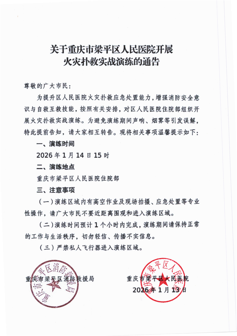 关于重庆市梁平区人民医院开展火灾扑救实战演练的通告