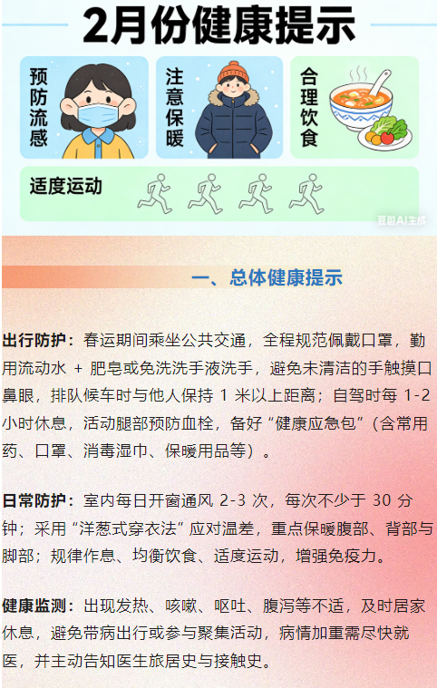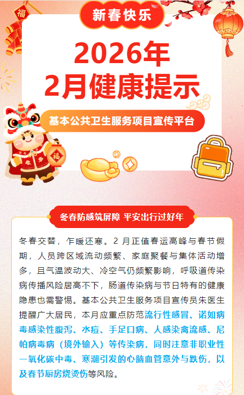 二月份健康提示:注意预防流感、诺如病毒感染性腹泻、水痘、手足口病、人感染禽流感、尼帕病毒病以及其他健康风险等