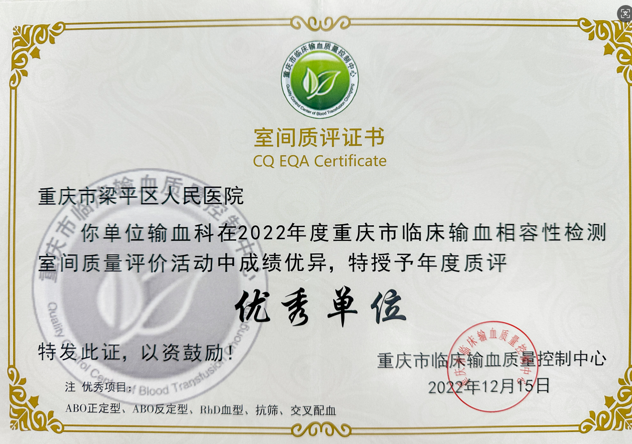 2022年度重庆市临床输血相容性检测室间质量评价年度优秀单位发布时间:2022-12-15
