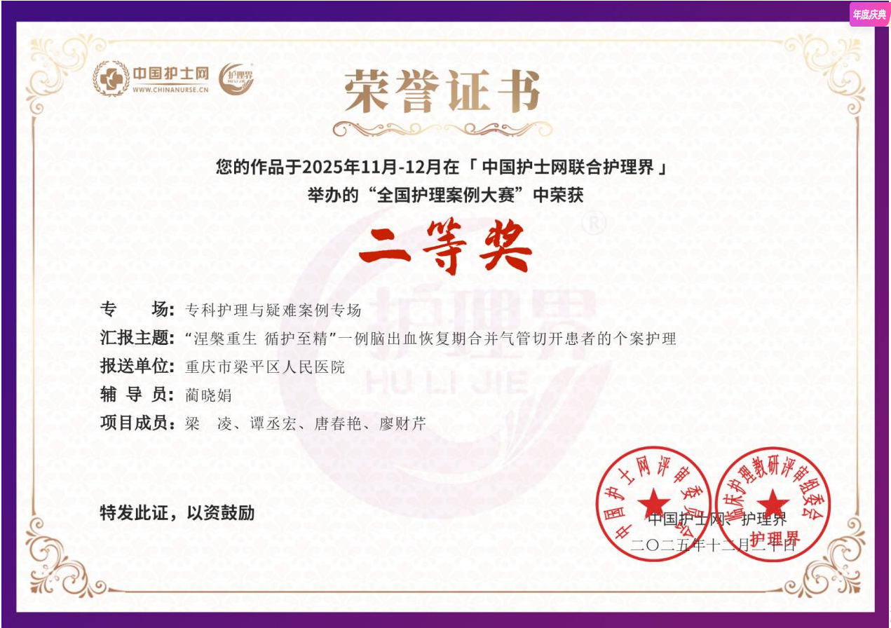 《“涅槃重生 循护至精”一例脑出血恢复期合并气管切开患者的个案护理》获“智护创优 案例赋能”全国护理案例大..发布时间:2025-12-25