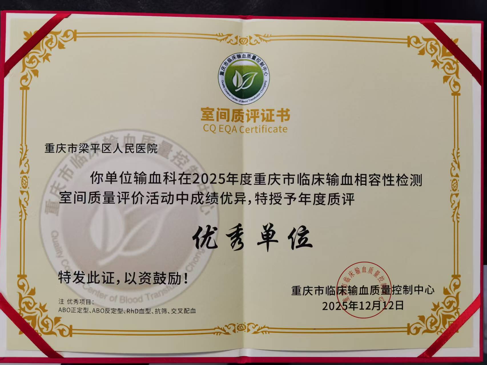 2025年度重庆市临床输血相容性检测室间质量评价优秀单位发布时间:2025-12-25