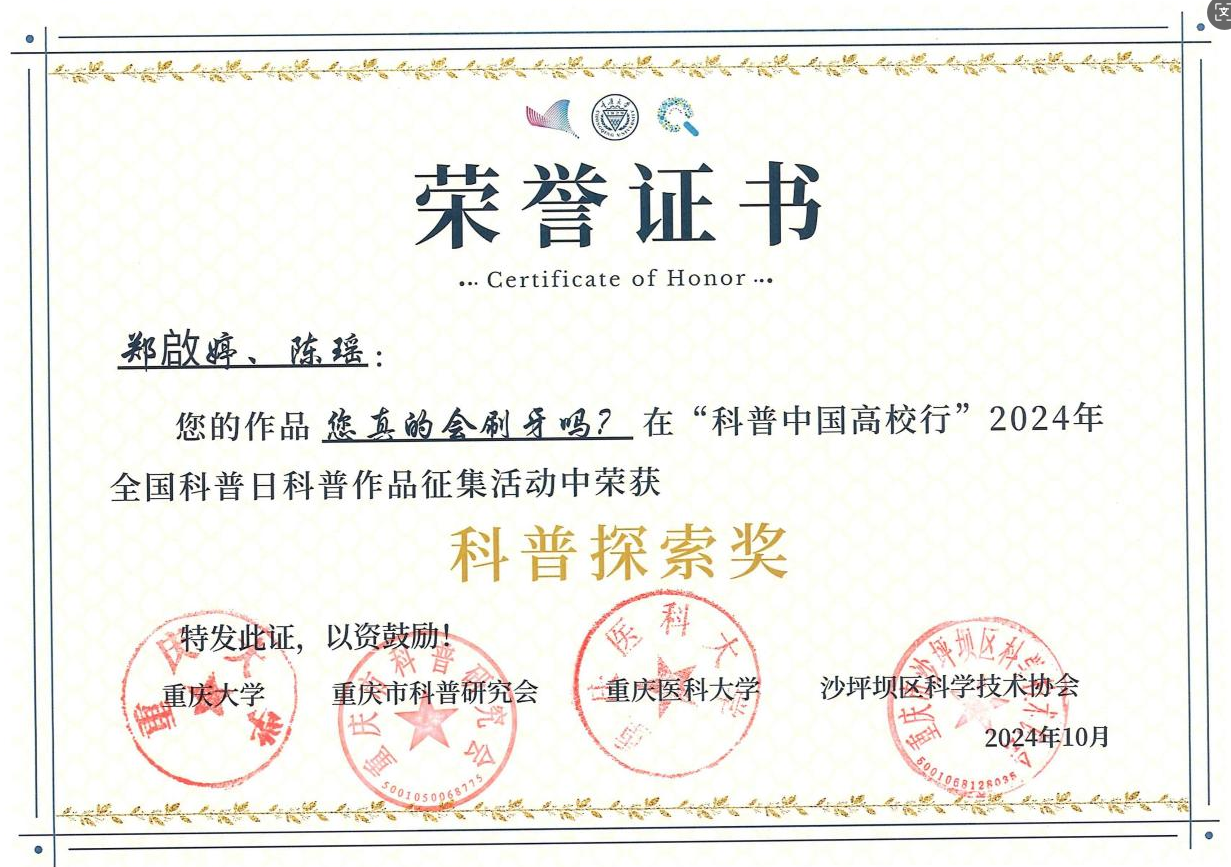 《您真的会刷牙吗》在“科普中国高校行”2024年全国科普日科普作品征集活动中获科普探索奖发布时间:2024-10-27