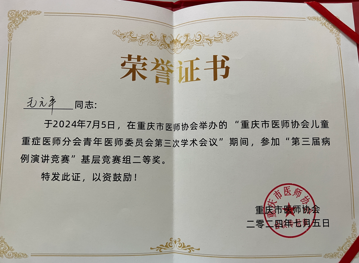 儿科毛元平2024年重庆市医师协会儿童重症医师分会第三届病例演讲竞赛基层组二等奖发布时间:2024-07-05
