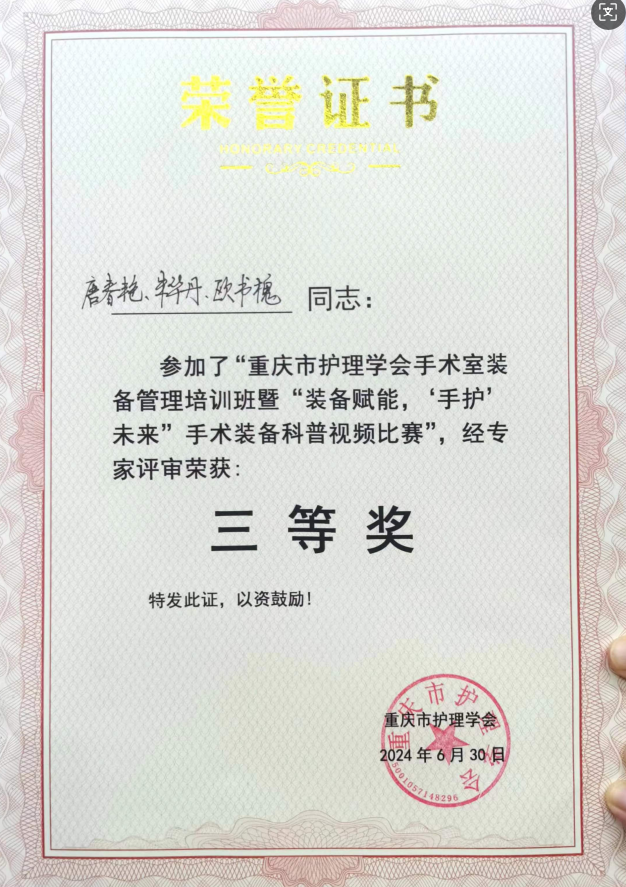 重庆市护理学会手术室装备管理培训班暨“装备赋能,手护未来”手术装备科普视频比赛”三等奖发布时间:2024-06-30