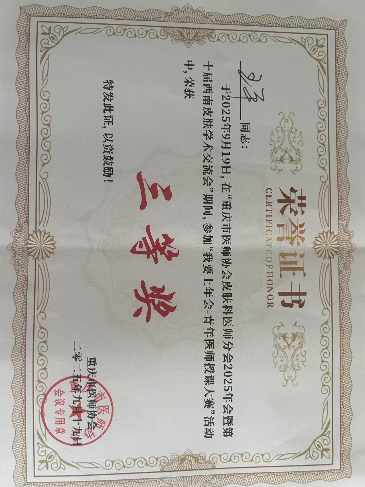 重庆市医师协会皮肤科医师分会2025年暨第十届西南皮肤学术交流会“我要上年会——青年医师授课大赛”三等奖发布时间:2025-09-19