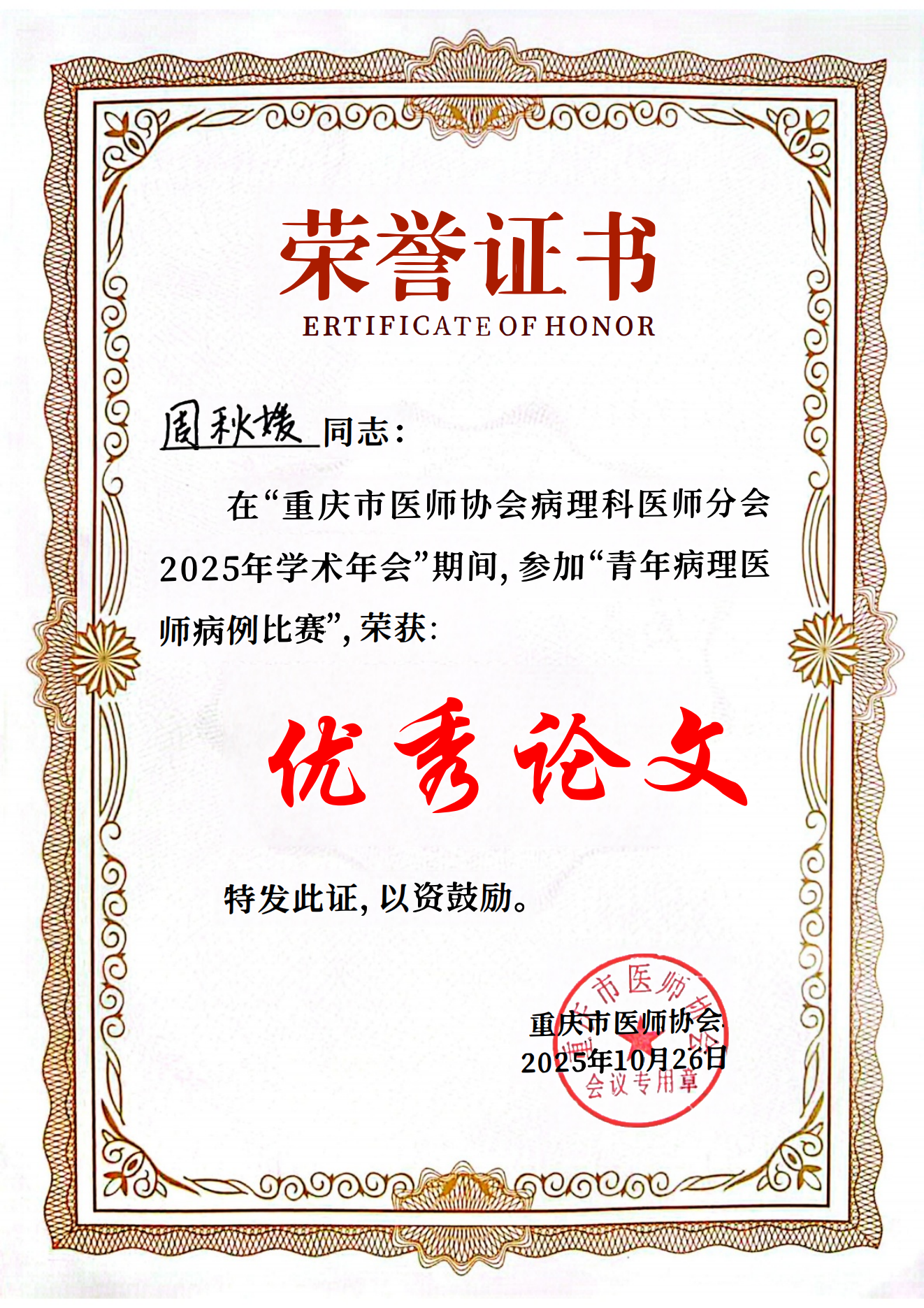重庆市医师协会病理科医师分会2025年学术年会青年病理医师病例演讲比赛优胜奖发布时间:2025-10-26